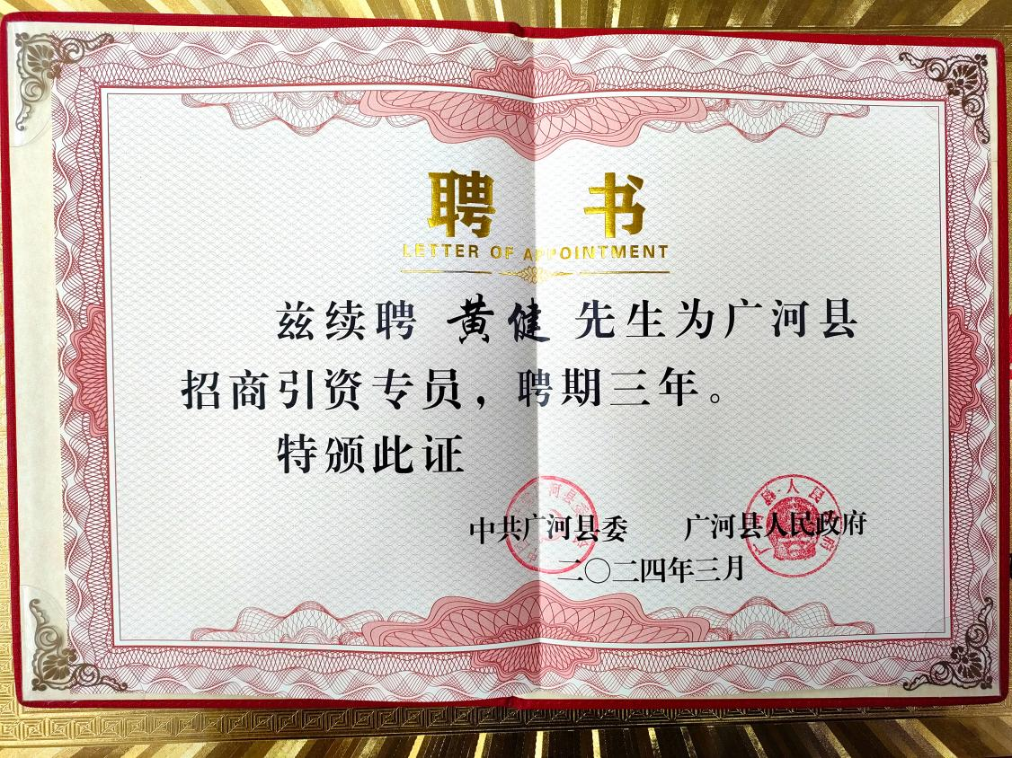 圖:燕之屋創(chuàng)始人、執(zhí)行董事兼董事長黃健被續(xù)聘為廣河縣招商引資專員