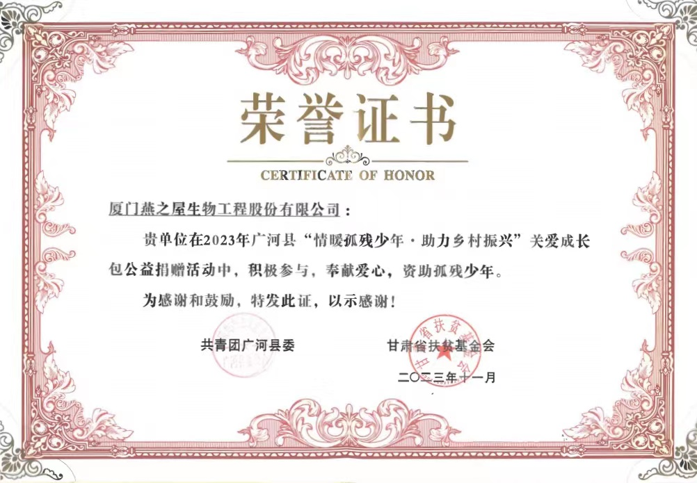 圖:燕之屋榮獲廣河縣“情暖孤殘少年·助力鄉(xiāng)村振興”關愛成長包公益捐贈活動榮譽證書