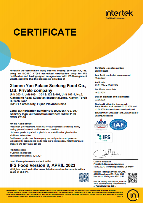 為了響應(yīng)美國官方的高標(biāo)準(zhǔn)要求,燕之屋分別通過了HACCP食品管理體系認(rèn)證、BRC全球食品安全標(biāo)準(zhǔn)認(rèn)證、IFS國際卓越標(biāo)準(zhǔn)認(rèn)證和食品出口備案資質(zhì),參加了美國FDA指定的由中國檢驗檢疫科學(xué)院舉辦的BSPC培訓(xùn),并順利通過考核獲得出口資格,通過了FDA、FCE、SID注冊。此外,燕之屋更主動將產(chǎn)品送至權(quán)威檢測機(jī)構(gòu)SGS,152項指標(biāo)檢測全部合格通過,印證燕之屋卓越產(chǎn)品力。2024年10月25日,燕之屋在廈門海關(guān)系統(tǒng)報檢通關(guān)。之后,燕之屋旗下高品質(zhì)燕窩產(chǎn)品冰糖官燕(60gx6、60gx12)、碗燕·禧孕款(80gx3)、碗燕·尊享款(158gx6)、碗燕·甄愛款(108gx6)、碗燕·濃鮮款(138gx10)通過美國食品藥品管理局(FDA)審批,順利運(yùn)抵紐約,正式上架開售,為當(dāng)?shù)叵M(fèi)者帶來來自中國的高端尊貴滋養(yǎng)。