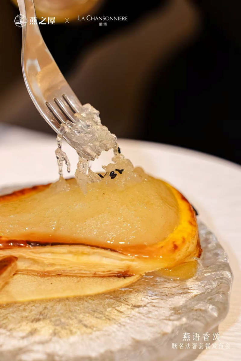 貝貝南瓜配燕之屋燕窩與手作土豆面團(tuán), 是融合了意大利和法式烹飪的傳統(tǒng)歐洲風(fēng)味餐品,由蘭頌生態(tài)農(nóng)場的南瓜和鼠尾草制作的意大利土豆面團(tuán),與燕之屋高品質(zhì)燕窩的創(chuàng)意碰撞,陳年意大利葡萄酒醋點(diǎn)睛,煥新味蕾體驗(yàn);法式傳統(tǒng)酥皮梨與燕之屋燕窩(Poire Belle Hélène), 是誕生于19世紀(jì)末的法國經(jīng)典的甜點(diǎn)之一,當(dāng)絲絲晶瑩剔透的燕窩與法式燉梨巧妙結(jié)合,清雅柔滑,相得益彰,滋補(bǔ)與甜美雙重升華。