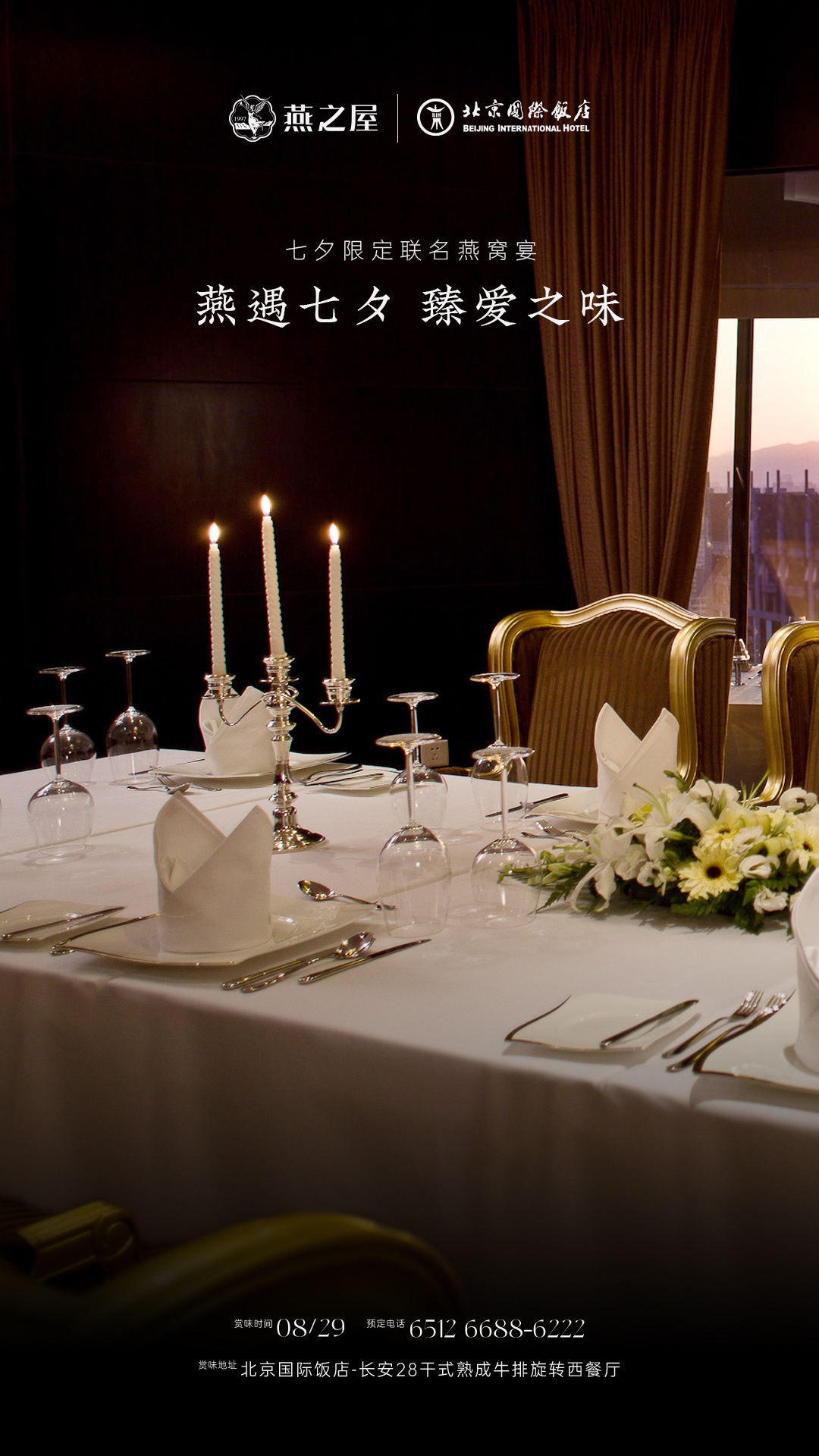 北京國際飯店長安28餐廳作為北京市中心高空360度環(huán)瞰京城盛景的旋轉(zhuǎn)餐廳,以其獨(dú)特的奢華與雅致并存的裝修風(fēng)格,成為京城高端餐飲場所。604㎡餐廳空間、100個(gè)精致餐位,3間多功能廳房,配合專業(yè)的服務(wù)團(tuán)隊(duì),為每位賓客提供尊貴的用餐體驗(yàn)。燕之屋27年專注高品質(zhì)燕窩,始終堅(jiān)持“源于天然,美與健康”的理念,以創(chuàng)新科研賦能上乘品質(zhì),連續(xù)九年高端燕窩全國銷售第一①。此次合作是云端視野與輕奢品味的雙重尊享,正如每一對相約七夕的甜蜜愛侶。