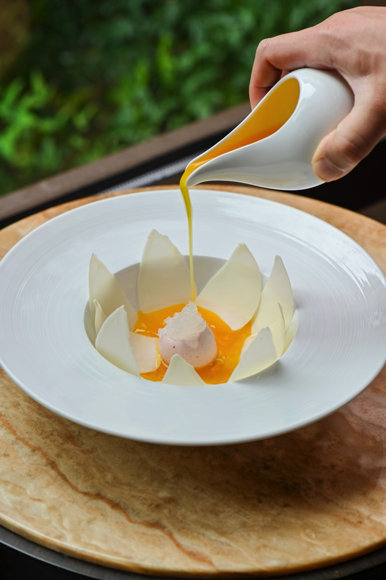 玉蘭花開映燕盞,是一道展現(xiàn)廚藝美學(xué)的匠心之作。白巧克力制成花瓣,包裹草莓慕斯花心,在溫潤芒果汁液的澆淋下仿若漸次綻放。燕窩藏于花蕊,細(xì)膩口感與靈動形態(tài)共同演繹出食境合一的東方意境。