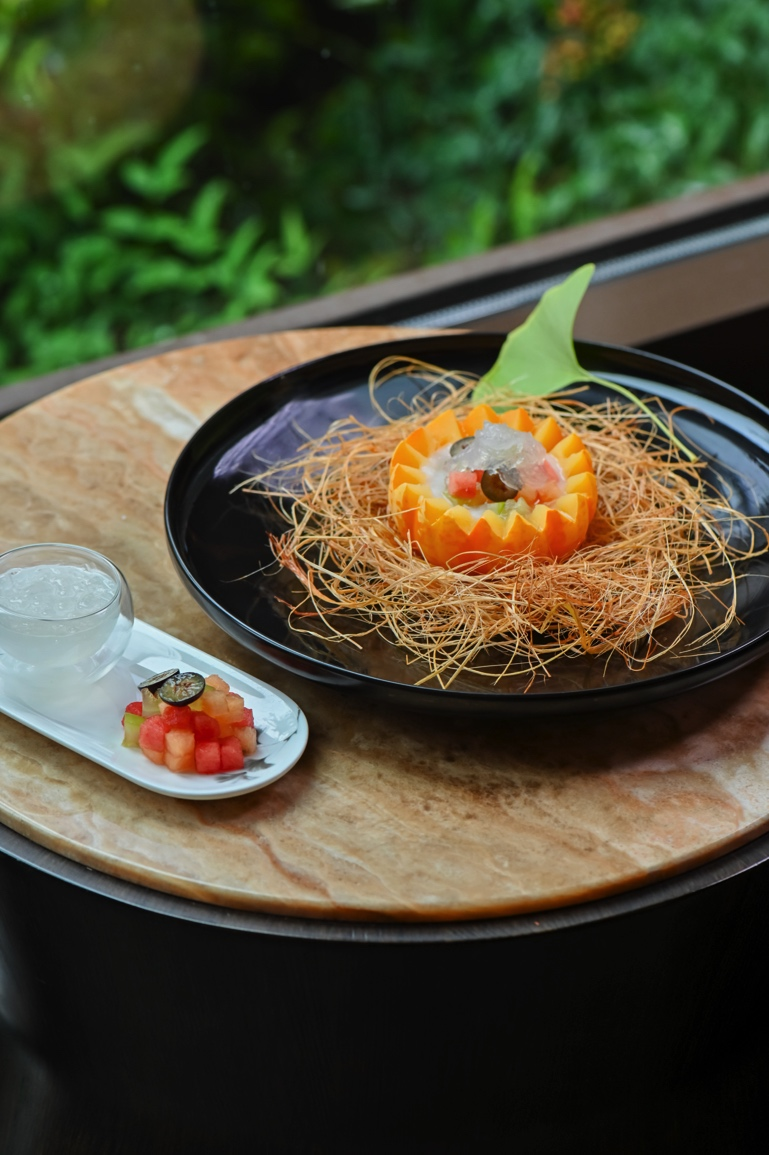 金巢玉露應(yīng)燕歸,取形制優(yōu)美的菊瓜為器,蒸至甘軟后注入香濃椰奶,綴入繽紛鮮果與晶瑩燕窩。瓜體的清甜與椰韻的馥郁相融,燕絲穿梭其間,營造出豐富而和諧的味覺體驗(yàn),寓意金秋歸巢,溫潤養(yǎng)人。