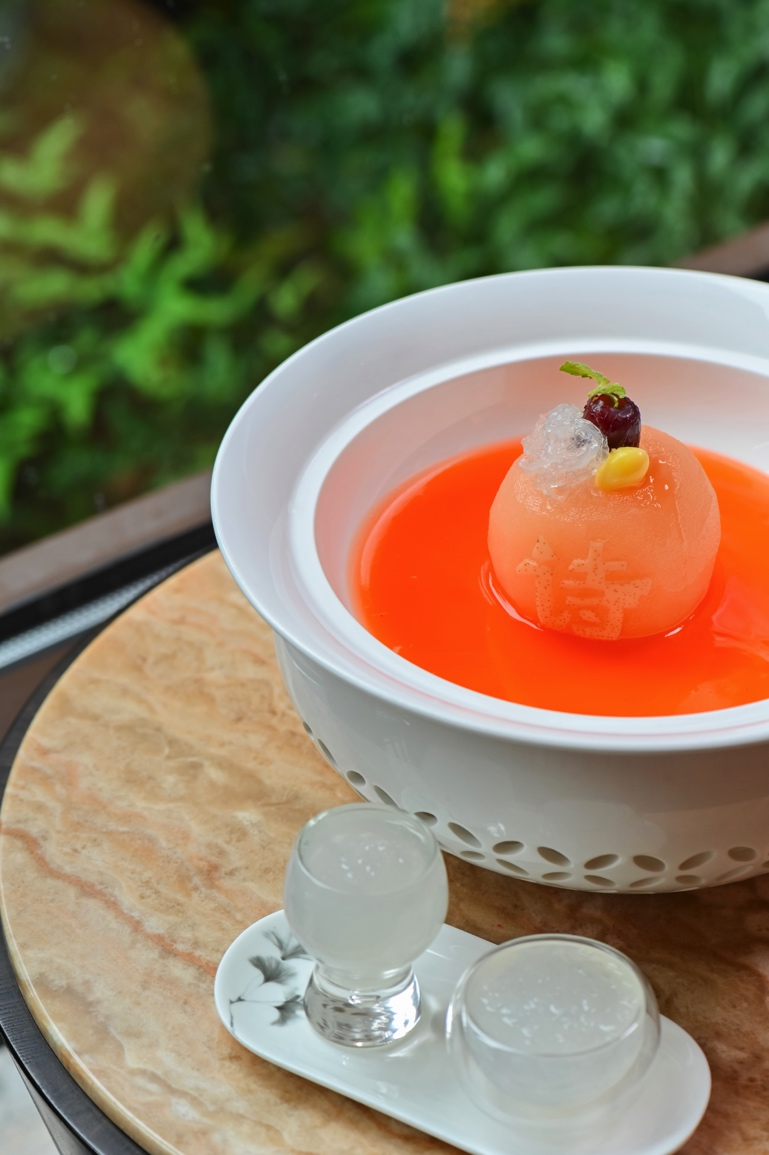 詩禮銀杏燉官燕,以雪梨為盞,內(nèi)嵌銀杏與紅棗,經(jīng)文火慢煨而成。待雪梨軟爛成型、銀杏和紅棗燉透入味,淋上以冰糖蜂蜜調(diào)制的原湯,入口時雪梨的清潤、銀杏的軟糯與燕窩的柔滑交織,宛如在舌尖展開一卷儒家詩禮篇章。
