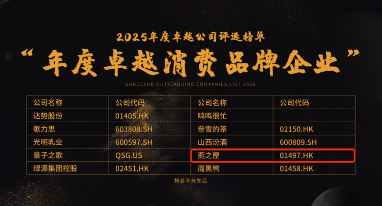 近日,格隆匯舉辦了“科技賦能·資本破局”分享會(huì),揭曉了2025年度卓越公司評(píng)選榜單。燕之屋(01497.HK)憑借其卓越的品牌影響力和持續(xù)創(chuàng)新的企業(yè)實(shí)踐,成功入選“年度卓越消費(fèi)品牌企業(yè)”榜單。