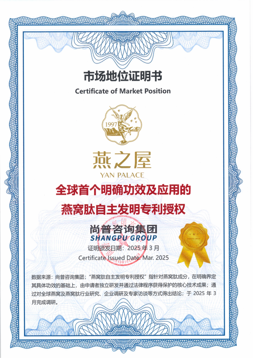 科研實(shí)力的卓越體現(xiàn),在于能否攻克行業(yè)共性難題并建立核心技術(shù)標(biāo)準(zhǔn)。燕之屋在燕窩肽領(lǐng)域取得關(guān)鍵突破,于2025年經(jīng)權(quán)威第三方機(jī)構(gòu)尚普咨詢集團(tuán)專業(yè)認(rèn)證,獲得“全球首個(gè)明確功效及應(yīng)用的燕窩肽自主發(fā)明專利授權(quán)①”市場(chǎng)地位證明書。該項(xiàng)認(rèn)證所基于的核心專利《一種具有促進(jìn)細(xì)胞修護(hù)、高保濕美白功效的燕窩肽制備方法及應(yīng)用》(專利號(hào):ZL 2022 11398048.3),徹底改變了傳統(tǒng)燕窩肽“成分模糊、功效籠統(tǒng)”的行業(yè)局面。該專利①明確了燕窩肽的定向酶解工藝,能夠?qū)⒀喔C大分子蛋白質(zhì)精準(zhǔn)切割為平均分子量小于3000道爾頓(Da)的活性小分子肽段。通過(guò)此工藝制備的燕窩肽,其促進(jìn)細(xì)胞修護(hù)、高效保濕及抗氧化等核心功能特性①獲得了明確界定與保護(hù),為產(chǎn)品的科學(xué)有效性奠定了堅(jiān)實(shí)的法律與技術(shù)基石。